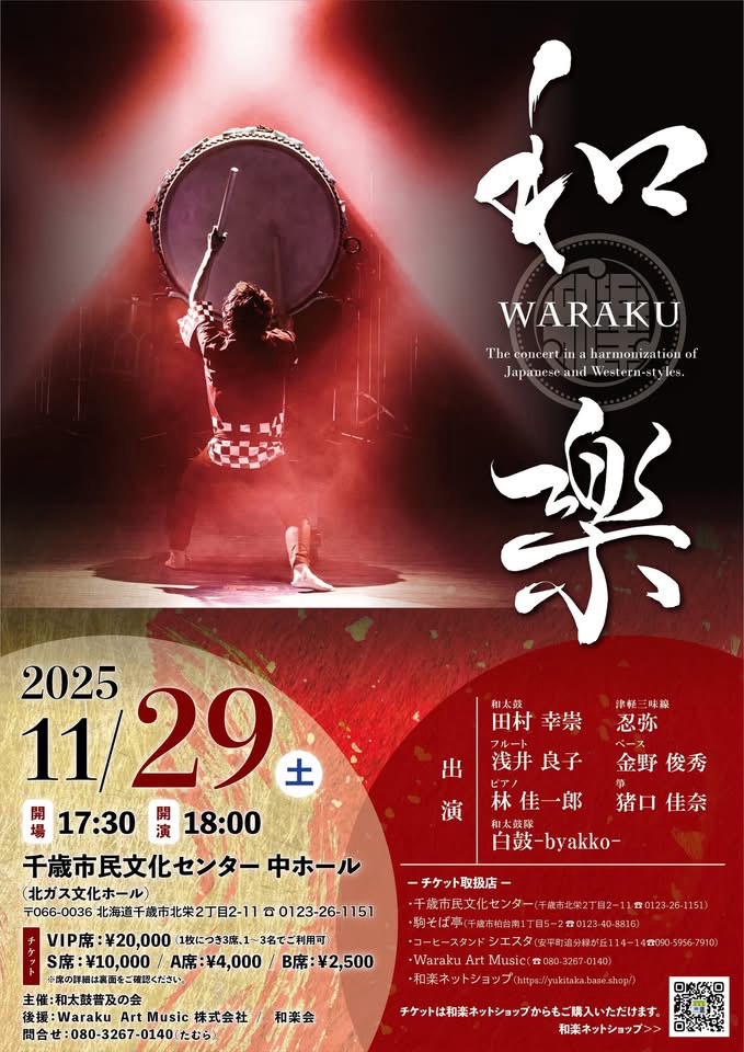 11/29 和楽(千歳市民文化センター中ホール) 開場17:30〜 開演18:00〜 和太鼓)田村幸崇、フルート)浅井良子、ベース)金野俊秀、キーボード)林圭一郎、箏)猪口佳奈、とのコラボレーションステージ
